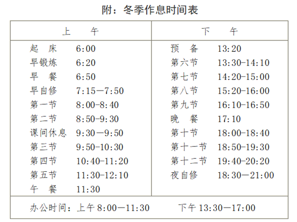 自10月7日(星期六)开始实行冬季作息时间表,请各单位遵照执行。