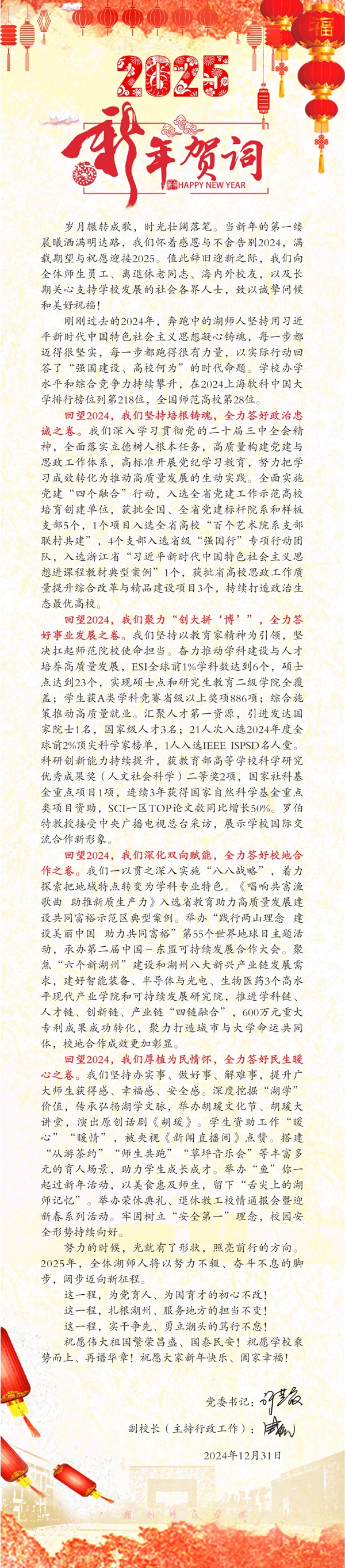 岁月辗转成歌,时光壮阔落笔。当新年的第一缕晨曦洒满明达路,我们怀着感恩与不舍告别2024,满载期望与祝愿迎接2025。值此辞旧迎新之际,我们向全体师生员工、离退休老同志、海内外校友,以及长期关心支持学校发展的社会各界人士,致以诚挚问候和美好祝福!